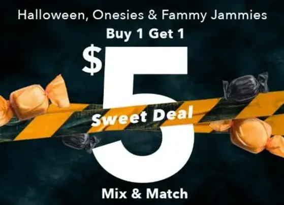 Don't miss out! Shop in store and enjoy buy 1, get 1 $5 on select Halloween onesies and fammy jammies, for a limited time.