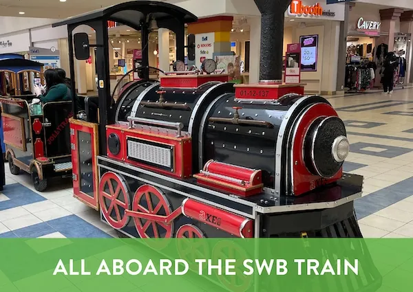 All aboard! Visit us to ride the SWB Train to support a good cause. Each ride is $4 per person with $1 donated to the Indigo Love of Reading Foundation.